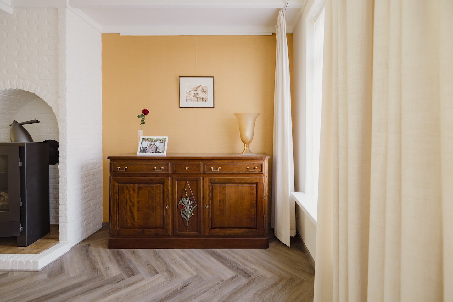 Le bon choix des couleurs confère à cet intérieur une sensation d’élégance et de modernité. La maison dispose d’une fenêtre avant orientée au nord et d’une grande véranda, ce qui a posé des défis mais aussi offert des possibilités en matière de lumière et de choix chromatiques. En optant pour Old White et Gold comme couleurs principales, une atmosphère élégante, calme et harmonieuse a été créée.