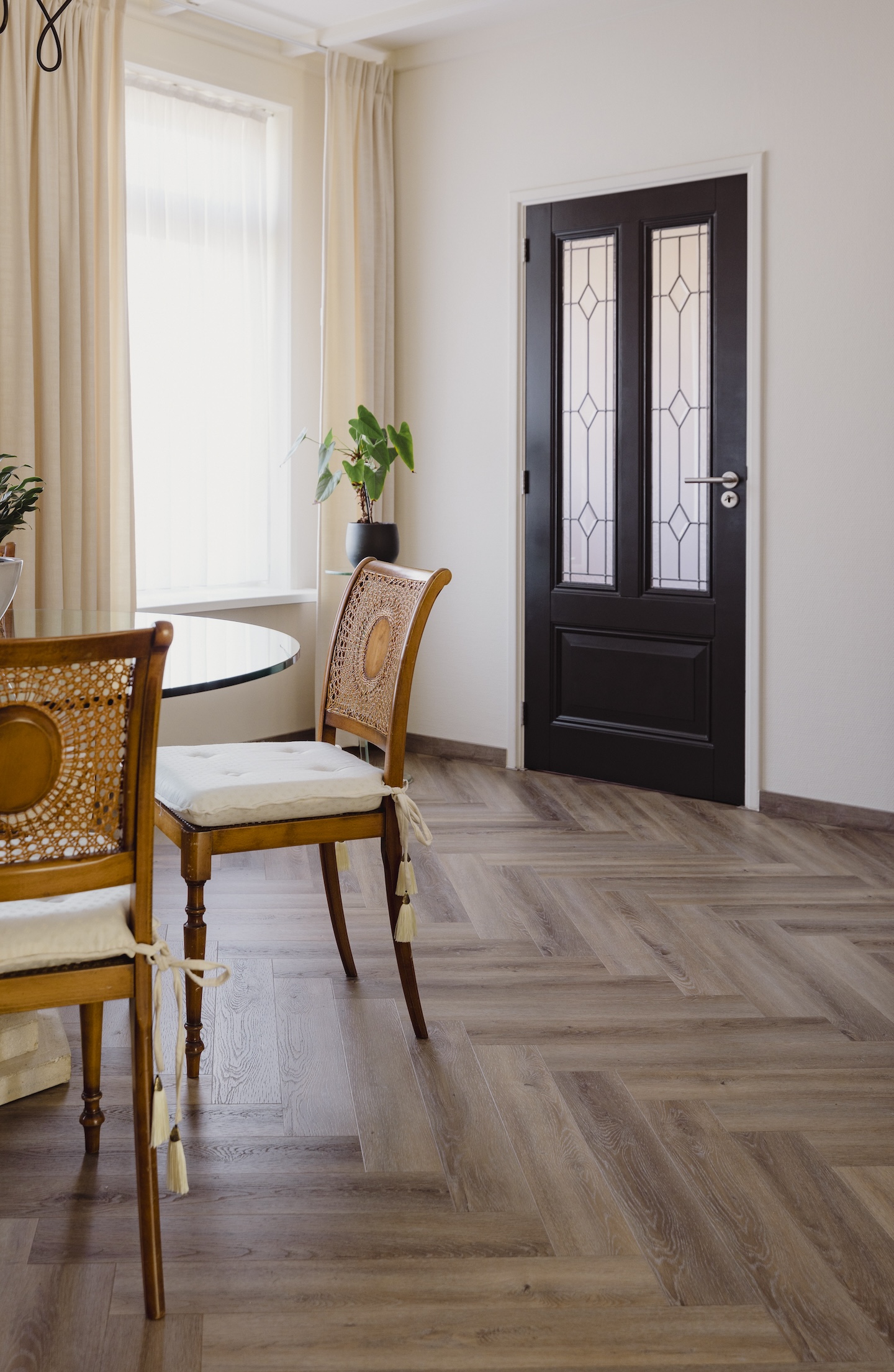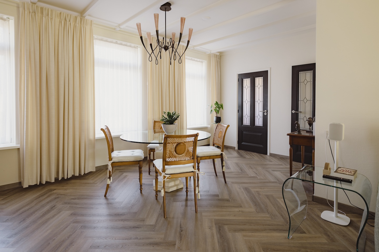 La véranda, le salon et la cuisine ont été aménagés avec une attention particulière portée aux détails et à la fonctionnalité. Partout, les plafonds sont peints en Snow White, ce qui confère à l’ensemble une sensation d’ouverture et d’espace. Les couleurs Old White et Gold apportent chaleur et ambiance, tandis que les accessoires et finitions en Cornwall Black donnent une touche moderne à l’intérieur. Chaque choix de couleur introduit, à sa manière, une émotion différente dans l’ensemble.